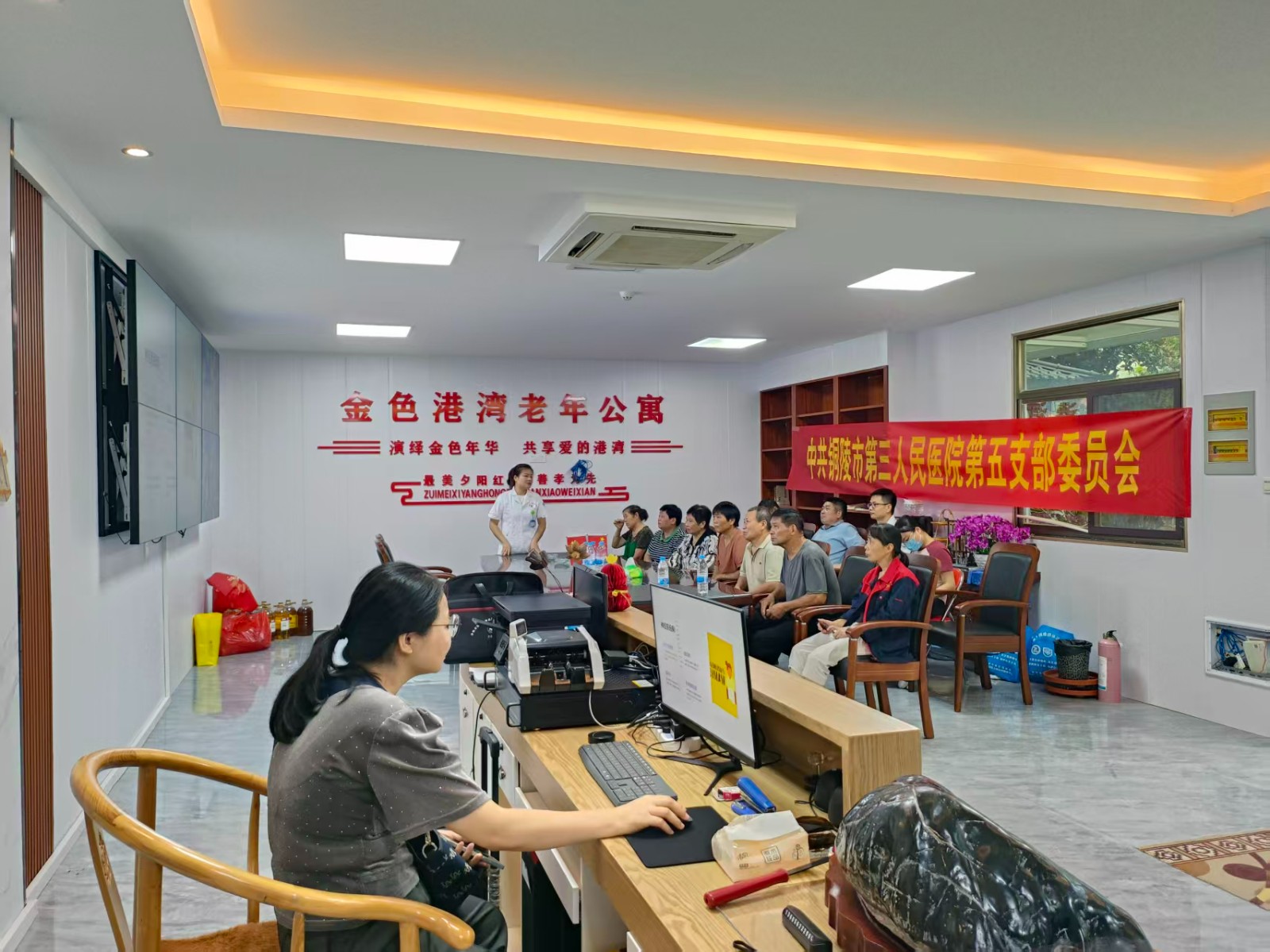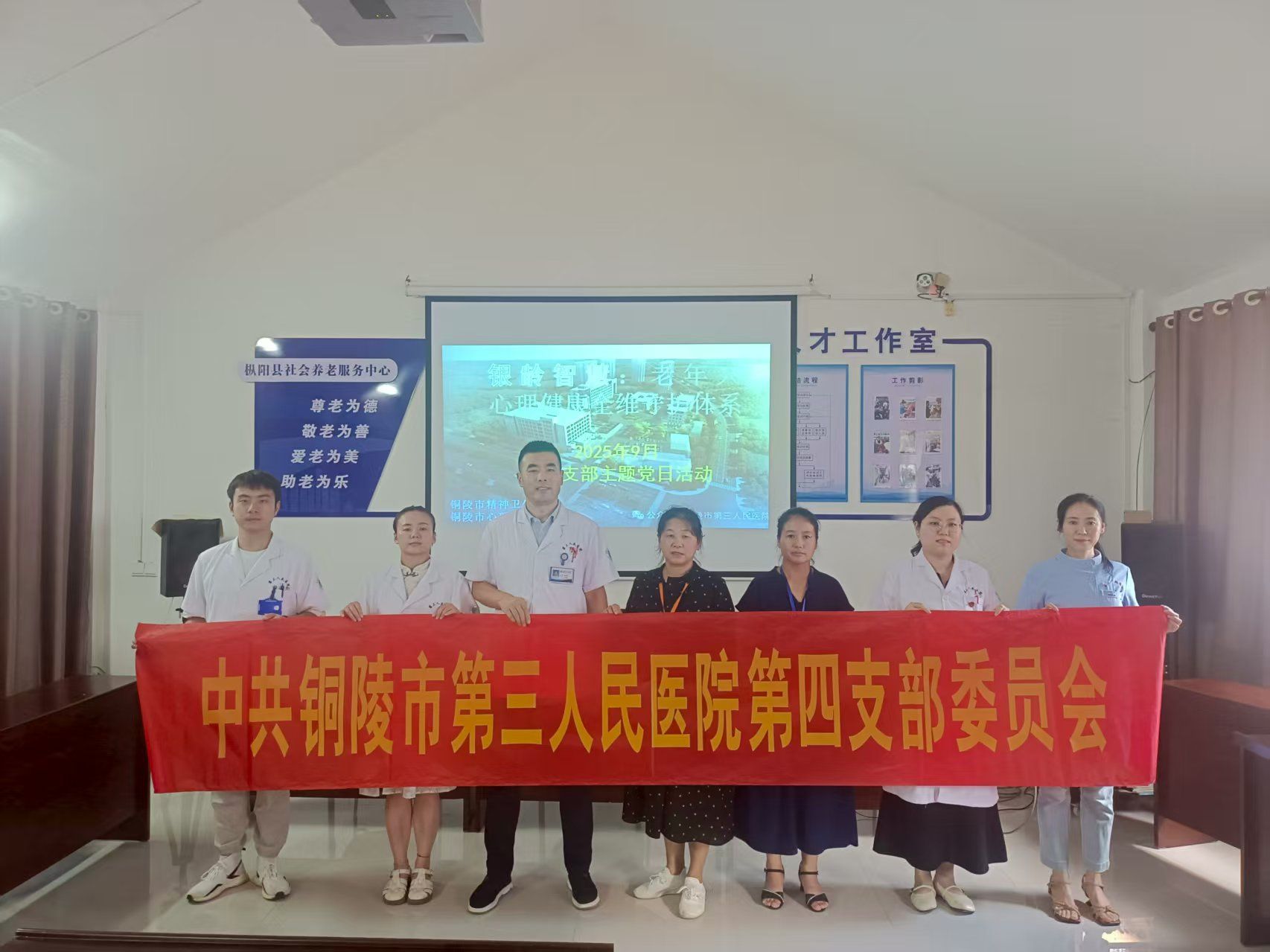 第二党支部率先行动,9月11日,组织党员走进铜陵市怡和永年健康医养中心养老院,开展“ 关爱银龄健康,守护幸福晚年”主题党日活动,以专业医疗力量为长者健康保驾护航。活动现场,医护人员聚焦“痴呆早发现、早预防、早治疗”与“褥疮防护科普”两大重点,不仅科普阿尔茨海默病早期信号(如近记忆减退、思维迟缓等),还通过趣味认知小游戏、一对一健康咨询传授脑力锻炼方法与饮食调理建议;针对长期卧床长者,现场演示翻身、体位摆放、皮肤护理等褥疮防护技巧,同时为长者免费测量血压、进行健康评估,让专业照护与温暖关怀融入养老院的每个角落。