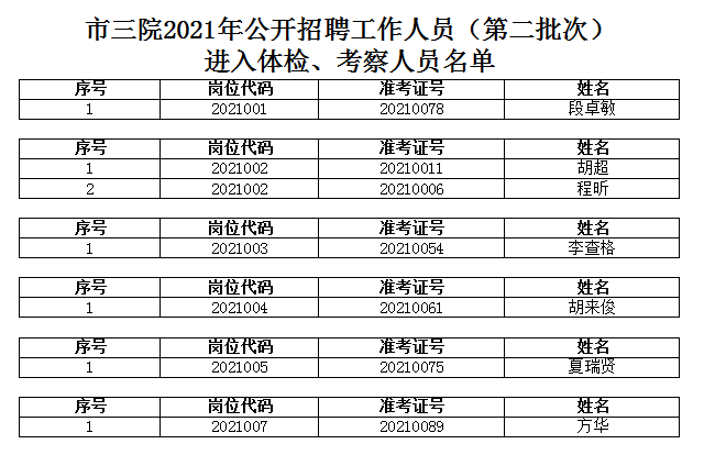根据《铜陵市第三人民医院2021年公开招聘工作人员公告》规定,现将市三院2021年公开招聘工作人员(第二批次)进入体检、考察人员名单公布如下: