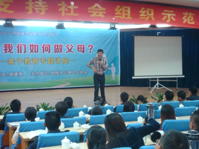 2013年11月2日,铜陵市心理卫生协会在五松山宾馆国际会议中心举办了一场名为“今天我们如何做父母”的专题讲座,主讲嘉宾为我国赏识教育首席咨询师魏建惠老师。魏建惠老师多年来一直潜心研究和探索“亲子教育与婚姻关系”的规律,将赏识教育核心理念与具体操作方法进行有效结合,解决家长亲子关系及婚姻关系中的各类困惑与问题,为无数身处教育困境的家庭带去了方法和希望。魏老师的讲座深入浅出,生动活泼。来自市心理卫生协会的会员以及部分老师、公安干警、社会群众等400多人聆听了讲座。