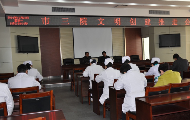 为做好全国文明城市迎检工作,12月22日上午,市三院召开全国文明城市迎检部署会,全院中层以上干部参加参加了会议。会上,副书记方堃同志传达了市卫生局12月19日文明创建会议相关精神。院长赵宜生同志就近期文明创建工作提出了六点要求。一是要进一步提高认识,高度重视创建工作;二是应知应会知识每人都必须掌握;三是各部门认真自查,做好台帐整理;四是积极开展文明志愿者活动;五是完善投诉机制,改善服务态度,保障医疗安全;六是做到院内院外一个样,争当文明好市民。