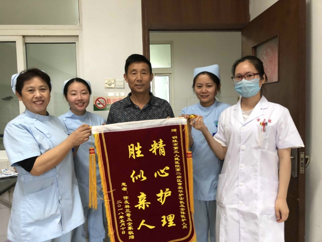 2018年5月21日上午,市三院二病区患者家属徐先生将一面写有“精心护理,胜似亲人”的锦旗送到市三院二病区护士长章爱华手中,感谢护士长及全体医护人员对病患精心治疗和贴心的照顾。(撰稿人:张海勤)
