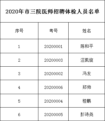 根据《铜陵市第三人民医院2020年公开招聘工作人员公告》规定,现将医师招聘进入体检人员名单公布如下: