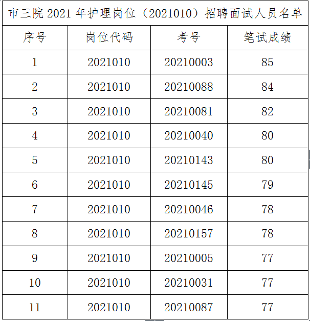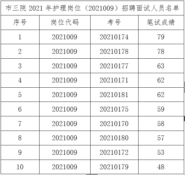 根据《铜陵市第三人民医院2021年公开招聘工作人员公告》,市三院2021年护理岗位(2021010、2021009)招聘考试面试入围人员共21人(含并列)名单如下,请面试人员于3月21日上午8:00前到市三院综合楼三楼抽签面试。
