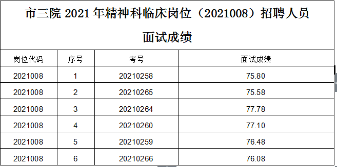 市三院2021年精神科临床岗位(2021008)招聘人员面试成绩如下: